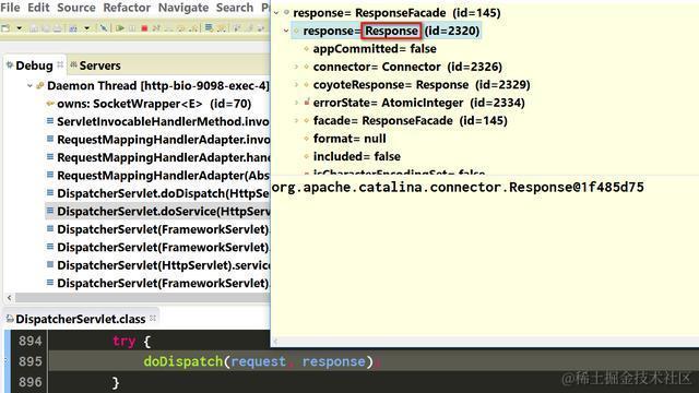 我们看下DispatcherServlet.doService里的HttpServletResponse里是否包含了我们期望的输出字符串。在调试器里展开response变量: