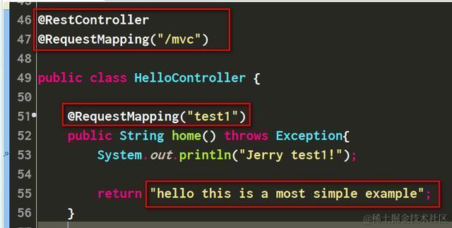 一个Spring MVC的项目文件里,开发人员没有开发自己的Servlet,只通过注解@RequestMapping定义了方法home能响应发向 /mvc/test1的请求。
