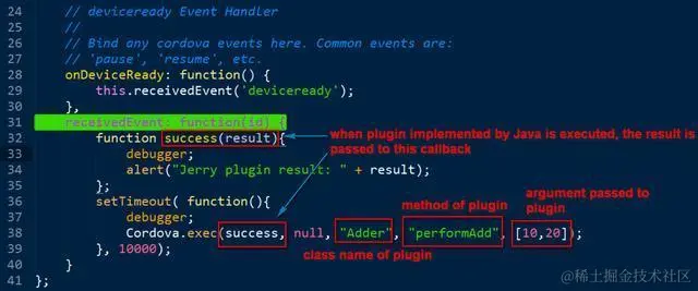 关键代码就这一句:Cordova.exec(success, null, “Adder”, “performAdd”, [10,20]);