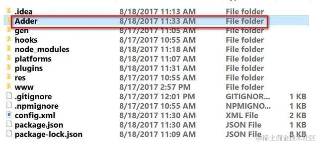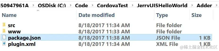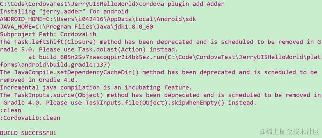 把这个自定义的插件安装到Cordova应用去,命令行:cordova plugin add Adder。