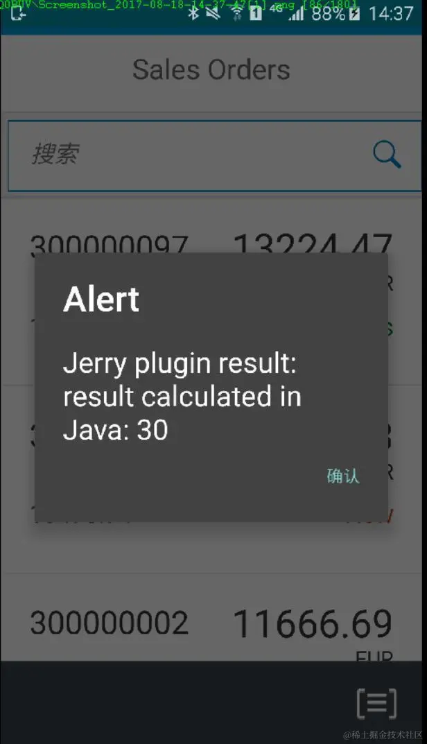 意思是调用名为Adder的插件,执行插件暴露的performAdd方法,传入两个参数10和20进去。Java插件的计算结果通过JavaScript回调函数success返回到前端应用中,用alert打印出结果。