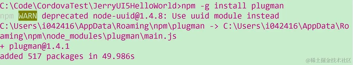 3. 插件实现完毕,可以开始打包了。使用命令行plugman createpackagejson ./