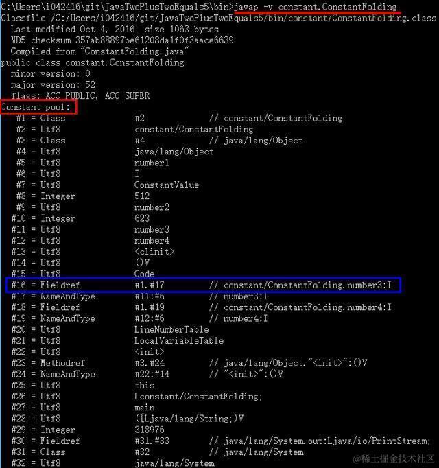我们再用javap -v 参数反编译,就能看到这个类的常量池(Constant pool). 大家看下图蓝色高亮的一行: