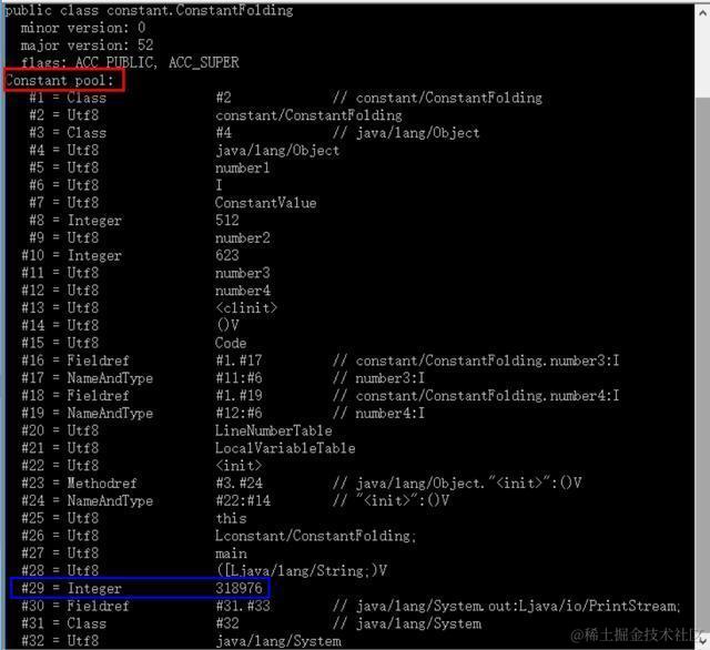 我们从下图的常量池列表能发现,序号为#29的常量318976正是整型常量number1(512)和整型常量(623)的积。由此可以看出, number1 * number2这个表达式,因为参与运算的两个操作数通过STATIC和FINAL修饰成为了整型常量,因此其积在编译期就能得到,所以编译器在编译时就计算出来,存储在变量池里,序号为#29。