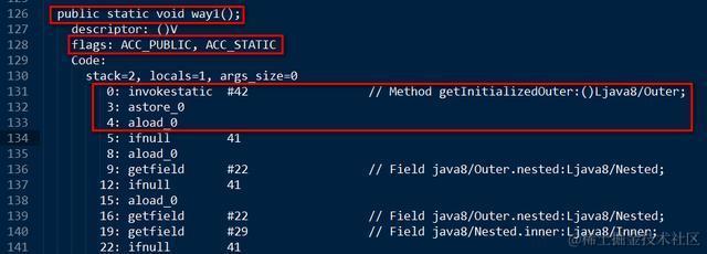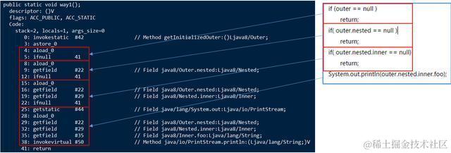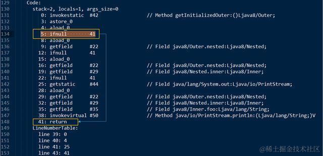 这就是我在Java源代码里书写的IF分支。如果IF分支里检测的outer引用为null,则直接返回了。体现在字节码就是,如果ifnull为true,则跳转到第41行字节码,即直接返回。