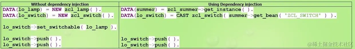 下图是基于ABAP常规实现和基于ABAP依赖注入思想的两套消费代码的比较,能清晰发现,采取了ABAP依赖注入后,