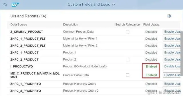 然后点击标签页“UIs and Reports”, 点击I_PRODUCTWD和MD_C_PRODUCT_MAINTAIN_MDLD对应的Enable Usage按钮: