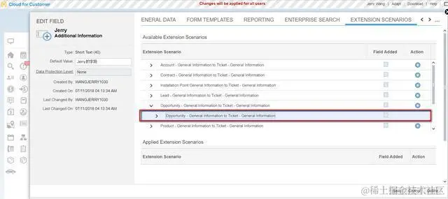 以上图的extension scenario为例:意思就是如果一个Opportunity上的扩展字段值为A,那么这个Opportunity生成的后续文档Service Request,其同名扩展字段的值也为A。