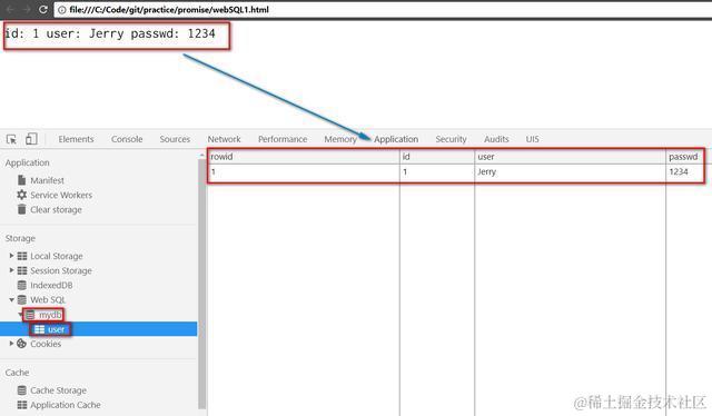 在浏览器里执行这个应用,会创建一个名叫mydb的数据库,里面一张名为“user”的数据库表,并且插入一条记录进去,然后从数据库表中读取中来,打印在浏览器上。