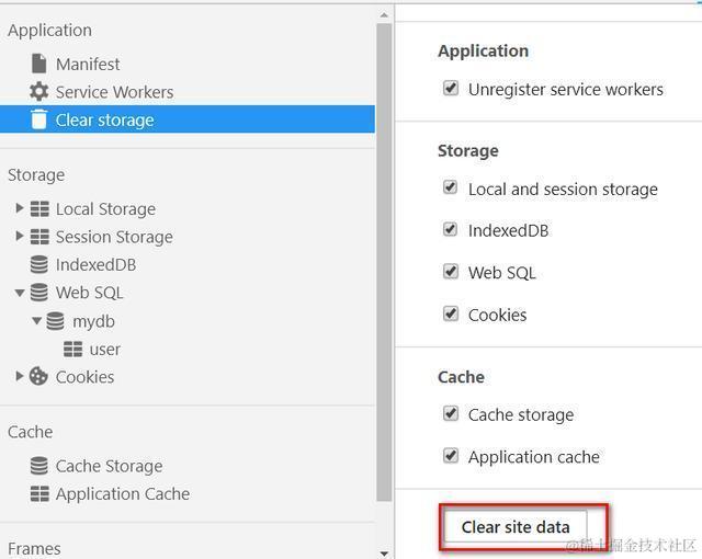 如果想清除掉Web SQL里的数据库表,在Chrome开发者工具里点击Clear storage: