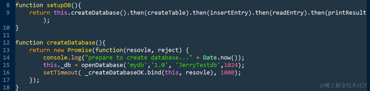用promise实现了一个链式调用,第九行代码从语义上来说很容易理解:首先创建数据库(createDatabase),然后创建数据库表(createTable),然后插入一条记录到数据库表里(insertEntry), 然后马上把刚才插入表里的记录读出来(readEntry)。最后打印到浏览器上。