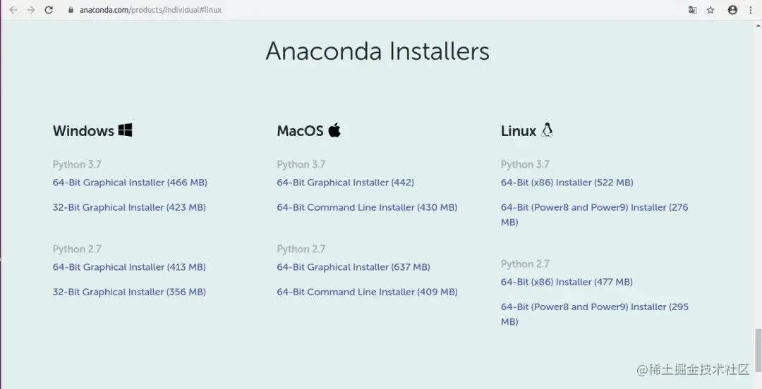 www.anaconda.com/products/in… Installers的位置,选择Python 3.7 下方的“64-Bit Graphical Installer (442)”。下载好
