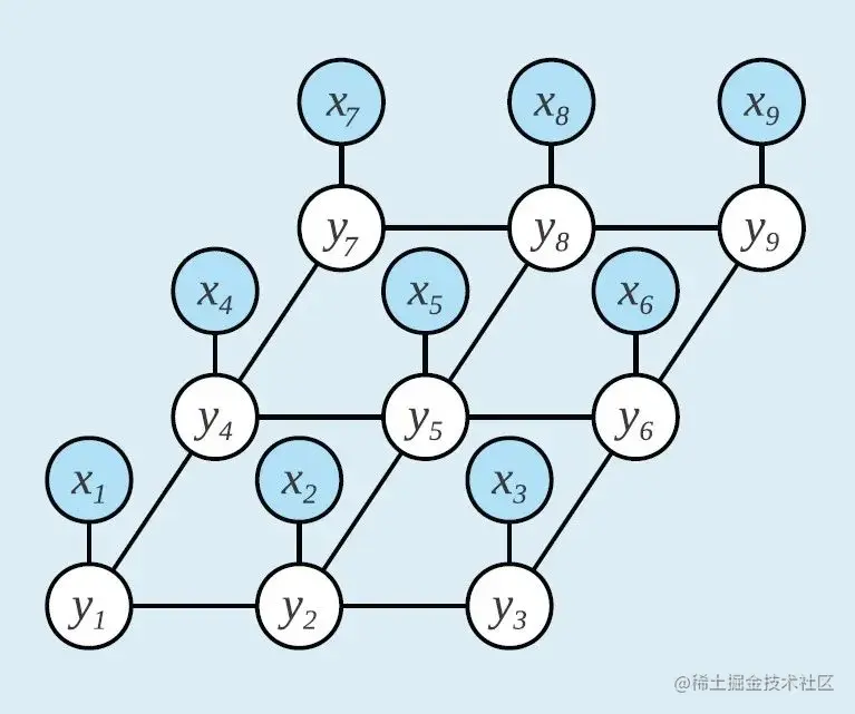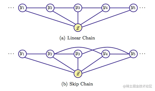 其中 表示在图中与结点 有边连接的所有结点 , 表示结点 以外的所有结点。从CRF的定义我们大致能够明白它就是一个满足马尔可夫随机场的条件概率分布,我们以线性链CRF为例来看其参数化表达方法。