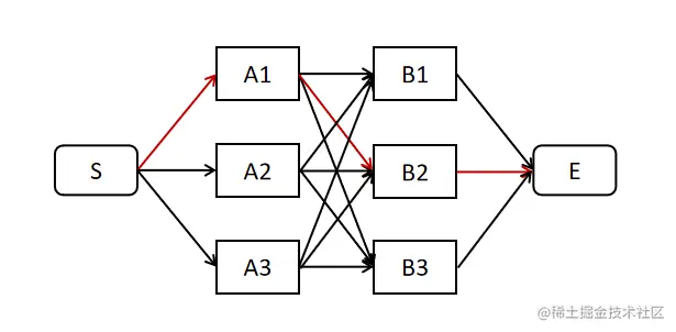 假设我们要在下述有向图中找出一条从 到 的最短路径。最简单粗暴的方法莫过于遍历所有路径然后比较一条最短的,但这么做时间复杂度太高。而维特比算法就是一种可以高效寻找最优路径的算法。