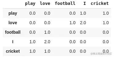 例如,考虑一个语料库:“play cricket, I love cricket and I love football”。语料库的共现矩阵如下所示: