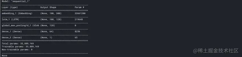 模型中可训练参数总数为33889169。其中,嵌入层贡献了33661200个参数。参数太多了!