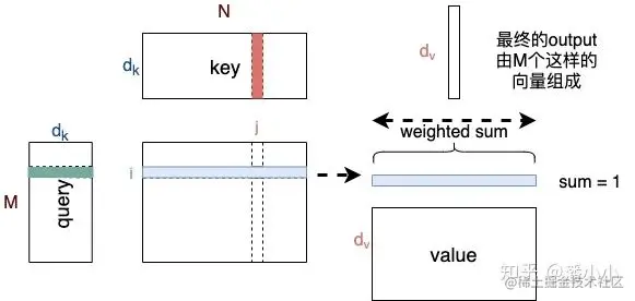 - Output每个位置 i 是由value的所有位置的vector加权平均之后的向量;而其权值是由位置为i 的query和key的所有位置经过attention计算得到的 ,权值的个数等于key/value的长度。