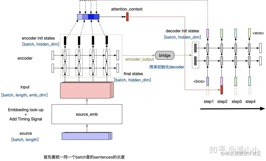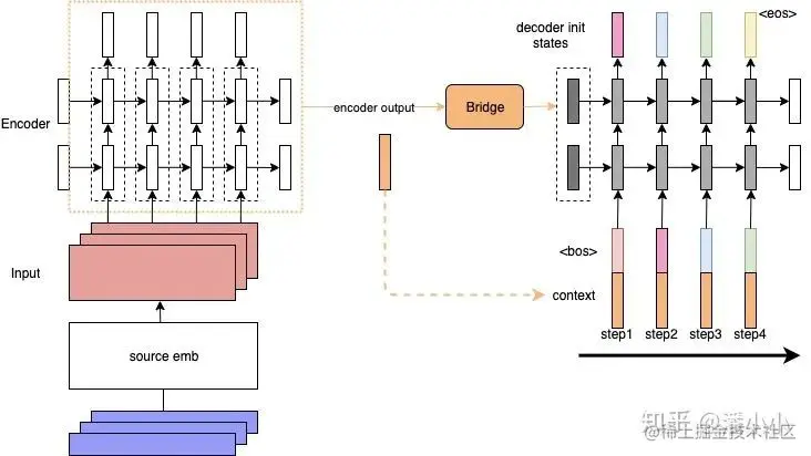 - 第二个问题同样由RNN的特性造成: 随着decoder timestep的信息的增加,initial hidden states中包含的encoder output相关信息也会衰减,decoder会逐渐“遗忘”源端序列的信息,而更多地关注目标序列中在该timestep之前的token的信息。