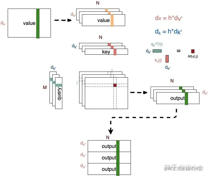 从上图可以看出, 和 之间的attention score从1个变成了h个,这就对应了h个子空间中它们的关联度。
