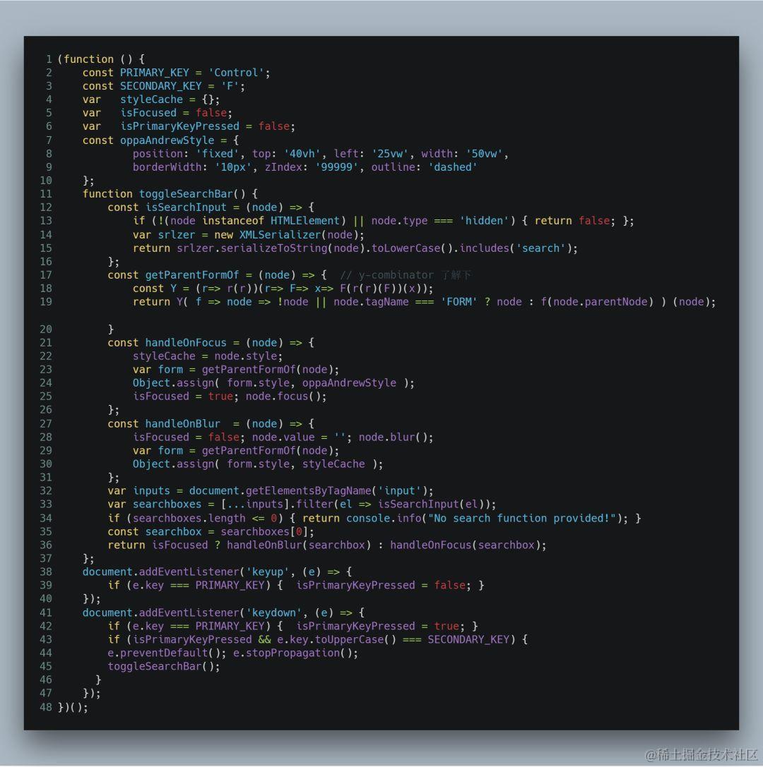 简单来说就是让我们对当前页面设置事件钩子,拦截CTRL+F的键盘输入。第一次使用CTRL+F,程序会去抓取搜索框的位置,并使用我们新定义的CSS oppaAndrewStyle去覆盖当前搜索框所属的form表单的CSS样式。效果如下图,搜索框被置于页中,并描框,这样我们就可以直接输入搜索关键字了;当用户再次使用 CTRL+F时候,搜索框内容会被清空,并且还原其CSS样式。