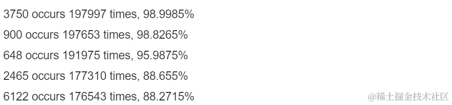 print("{} occurs {} times, {}%".format(word_count[i][0], word_count[i][1], (word_count[i][1]/200000)*100))