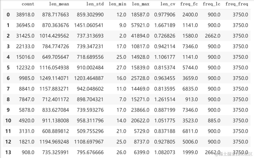 df_train_info = pd.DataFrame(columns=['count','len_mean','len_std','len_min','len_max','freq_fc','freq_lc','freq_freq'])