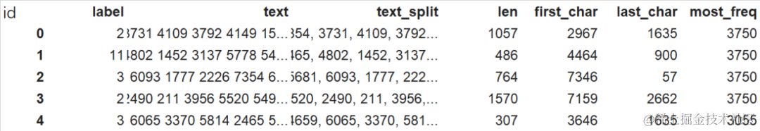 - 训练集中总共包括6869个字,最大数字为7549,最小数字为0,其中编号3750的字出现的次数最多,编号3133的字出现的次数最少,仅出现一次,其中字符3750、字符900和字符648在20w新闻的覆盖率接近99%,很有可能是标点符号。