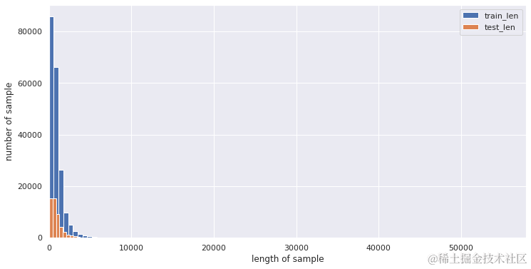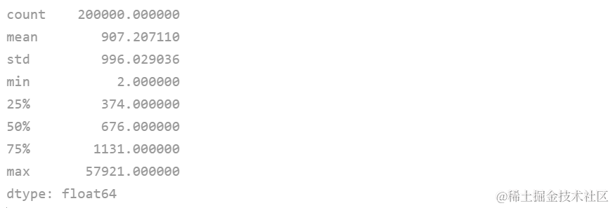 - 训练集共200,000条新闻,每条新闻平均907个字符,最短的句子长度为2,最长的句子长度为57921,其中75%以下的数据长度在1131以下。