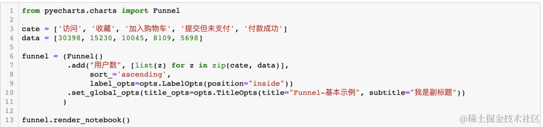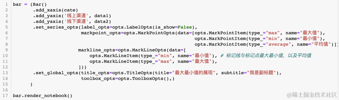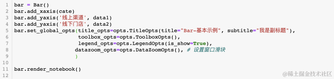 | 3 | 添加标题等其他配置 | bar.set_global_opts() |
