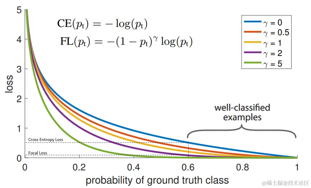 在上图中,“蓝”线代表交叉熵损失。X轴即“预测为真实标签的概率”(为简单起见,将其称为pt)。举例来说,假设模型预测某物是自行车的概率为0.6,而它确实是自行车, 在这种情况下的pt为0.6。而如果同样的情况下对象不是自行车。则pt为0.4,因为此处的真实标签是0,而对象不是自行车的概率为0.4(1-0.6)。