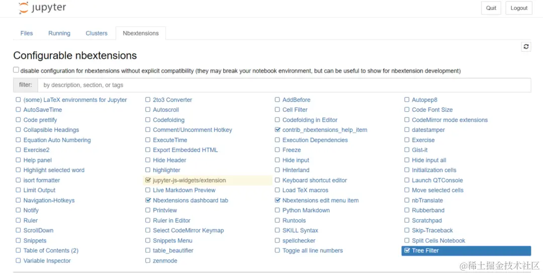pip install jupyter_nbextensions_configurator - 重启 Jupyter Notebook, 能看到nbextension 标签
