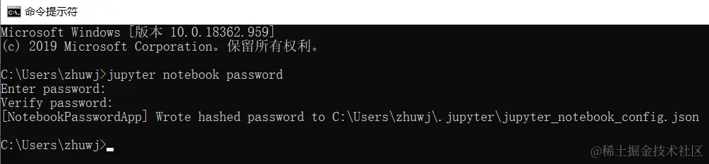 c.NotebookApp.allow_password_change元素,修改为:NotebookApp.allow_password_change=False,并且删掉前面的注释#,保存文件; - 回到windows命令行,运行