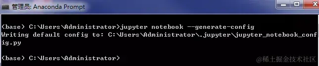 这个配置文件一开始并不存在,需要手动生成。方式很简单,在命令行输入jupyter notebook --generate-config并执行,配置文件就创建好了,它的位置是在C:\Users\Administrator\.jupyter\中。然后我们去c盘主目录下打开.jupyter文件夹,就能找到配置文件: