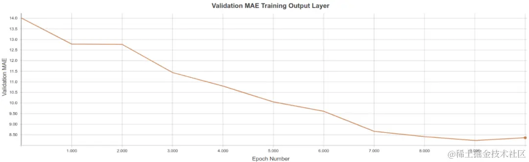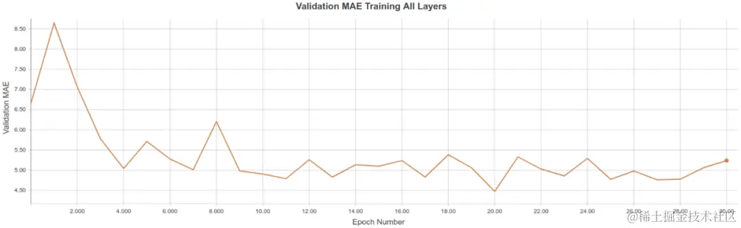 首先对模型进行训练,使原始年龄分类器的每一层都被冻结,以允许新输出层的随机权值进行更新。第一次训练包含了10个epoch,因为在此之后,MAE没有明显的下降(使用early stop)。