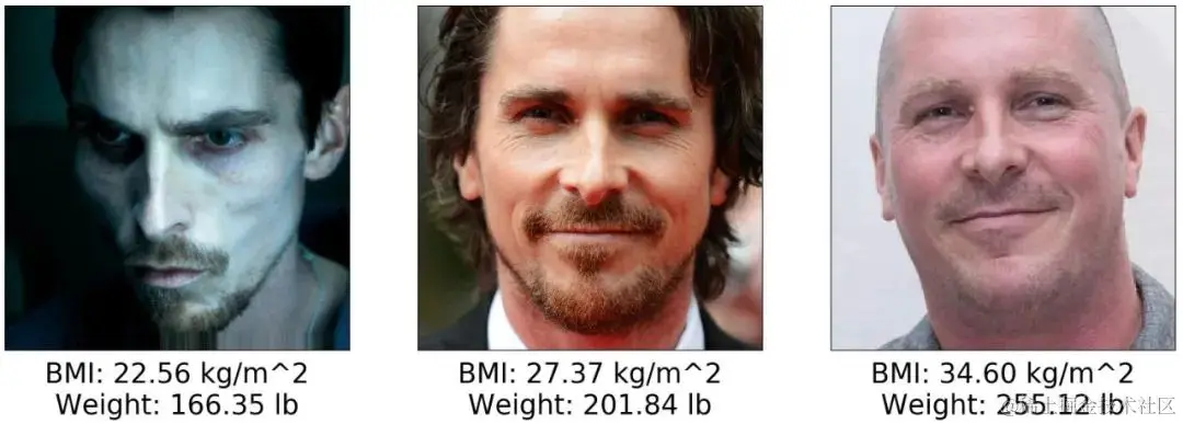 下面是模型通过Christian Bale的几张照片预测出的体重指数。之所以选择贝尔作为研究对象,是因为众所周知,他会在不同的角色中剧烈地改变自己的体重。知道了他的身高是6英尺0英寸,他的体重就可以从模型的BMI预测中得到。