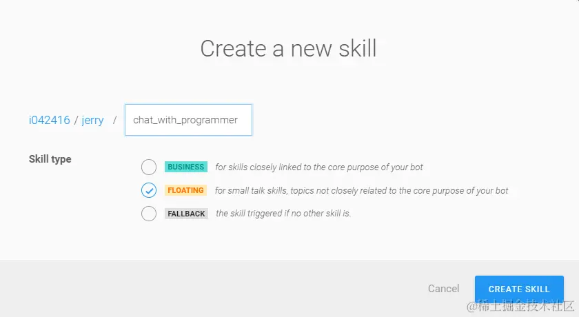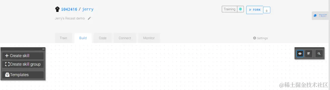 那么我们就结束训练,进入下一个”Build”步骤。这个步骤负责定义当您的聊天机器人成功识别到了您的输入是在讨论程序员后,应该执行何种动作。Recast.AI把机器人这种成功识别出文本的intention后执行某种动作的能力,称为skill。在Build标签页点击Create skill: