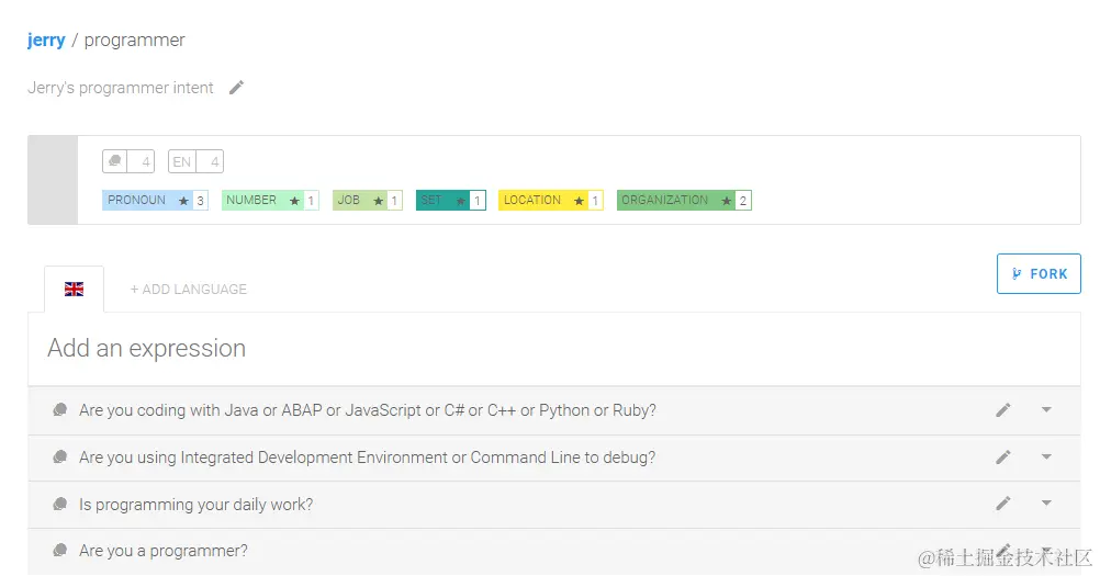 Recast.AI会自动将这个句子进行分词,并且识别出一个代词(Pronoun) - You, 一个数量词(Number) - a, 和一个工作描述(Job) - programmer。