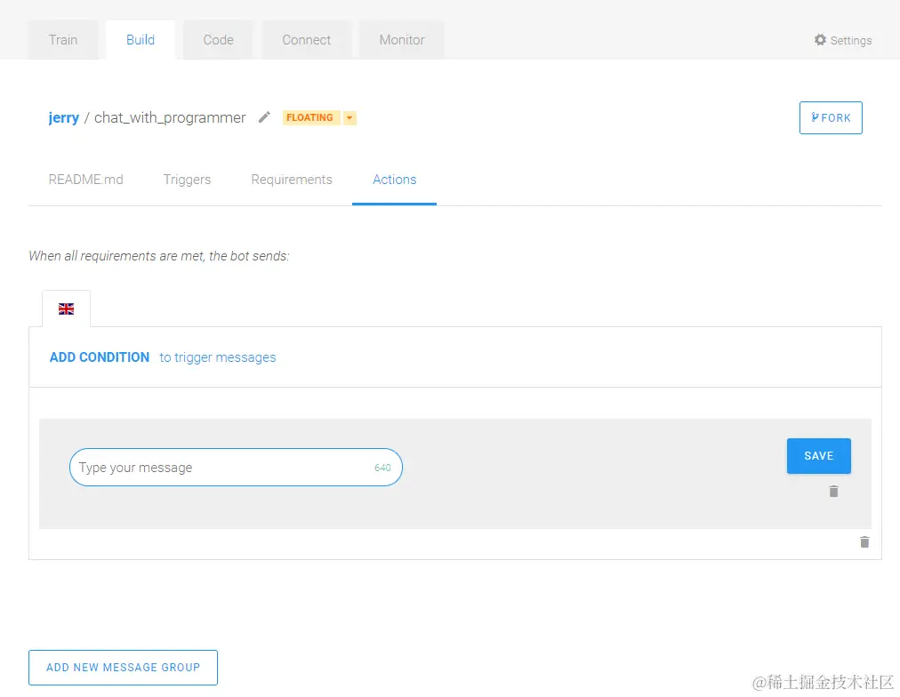 这里我定义的Actions就是简单地推送一些文本(SEND MESSAGE)给用户。
