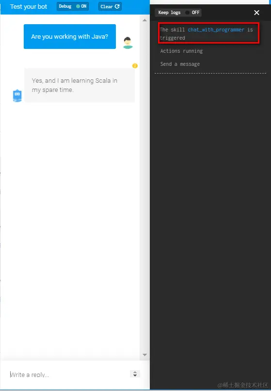 点击Build标签页的”CHAT WITH YOUR BOT”进行测试。随便输入一句和程序员相关的话,比如”Are you working with Java?” 在测试页面,看到了机器人自动给我推送了一个回复,同时显示了我之前创建的”chat_with_programmer” skill已经被触发(triggered)了。这意味着Build标签页里的配置也已经完成。