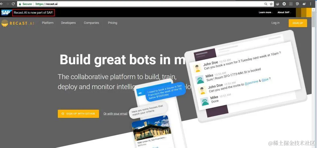 现在,访问recast.ai, 能看到一行醒目的提示:Recast.AI is now part of SAP。那么Recast.AI提供了怎样的功能呢?最好的入门办法,莫过于自己动手做一个Hello World例子出来。跟着Jerry一块做一个吧。