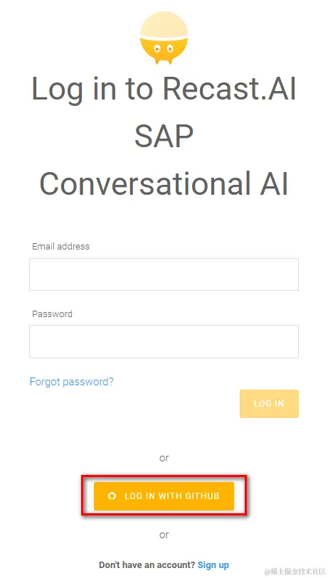 我们在Recast.AI网站上在线创建聊天机器人。一般网站首次登陆都需要先创建用户,而Recast.AI除了常规用户注册方式外,还贴心地提供了使用Github账号直接登录的选择,对于每天混Github的程序员来说,这太方便了。