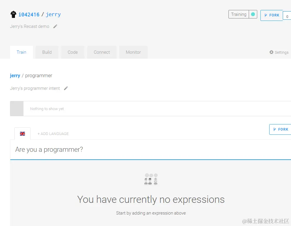 现在新建的这个programmer intent还没有任何语句,现在我们就来给它“喂”一些句子,这个动作称为”Train(训练)”。输入一个句子”Are you a programmer?”,回车: