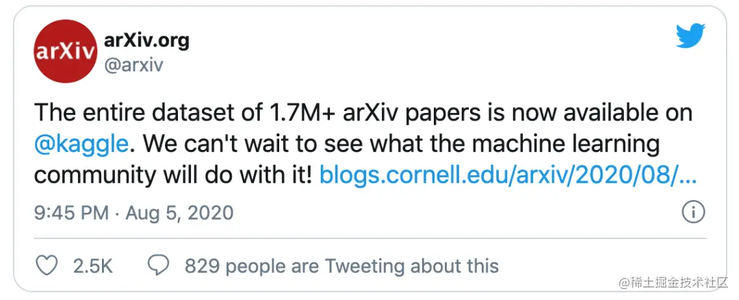 于是,为了让 arXiv 更加易于访问,康奈尔大学现在在 Kaggle 上提供了一个免费、开放的 arXiv 数据集。