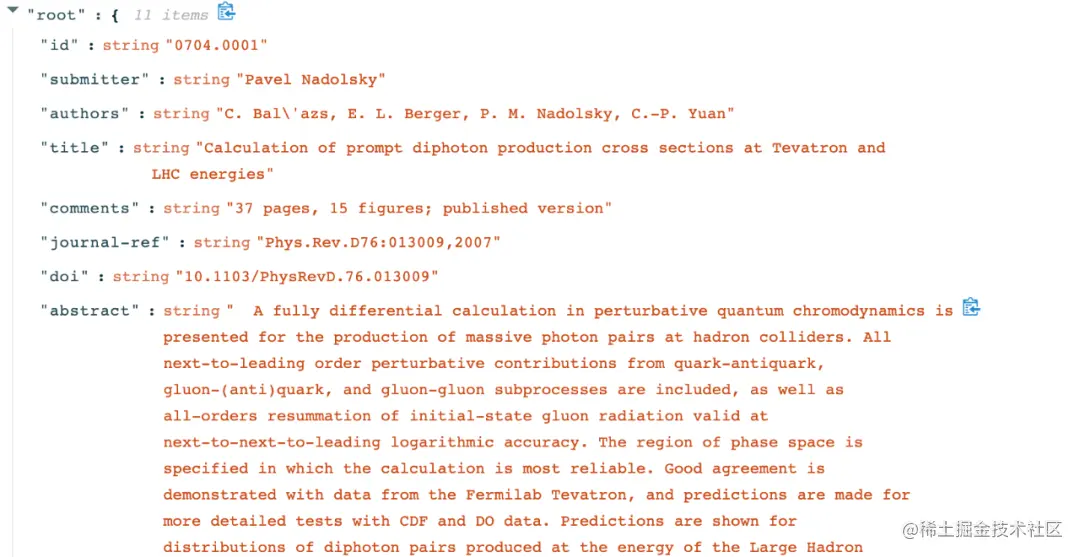 目前,arXiv 数据集提供了 json 格式的元数据文件,它包含每篇论文的相关条目,具体如下: