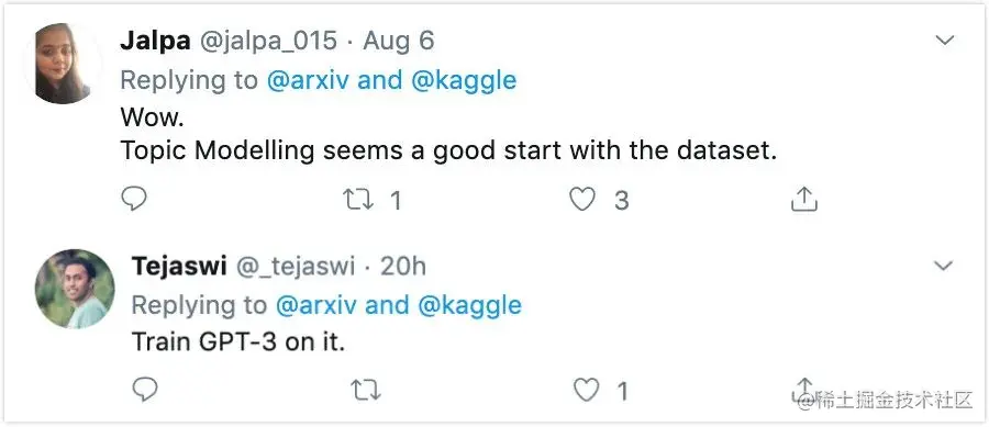 不过,这个数据集具体有哪些使用场景呢?很多网友已经有了想法,比如主题建模、用该数据训练 GPT-3 等。\