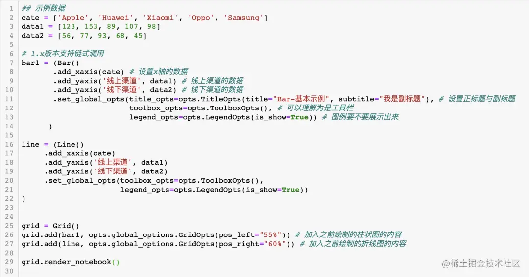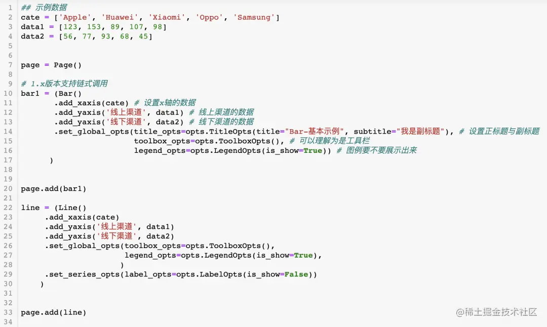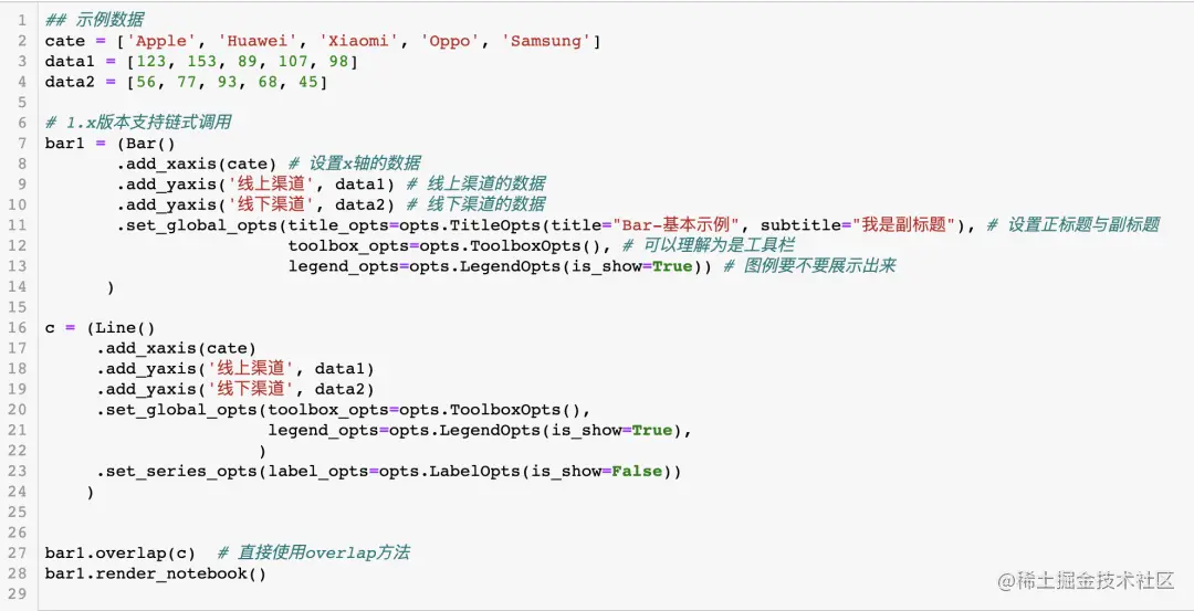 使用者可以自定义结合Line/Bar/Kine/Scatter/EffectScatter/Pie等图表,将不同类型的图表画在一张图上,利用第一个图表为基础,之后的数据都会画在第一个图表之上,而在新版的pyecharts中,直接对图表使用overlap()方法即可