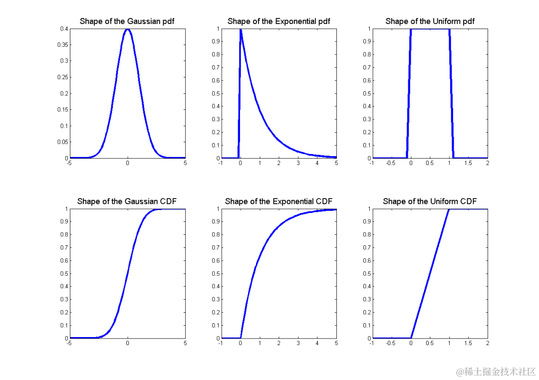 一些随机变量的概率密度函数和累积分布函数的形状如图 2 所示。