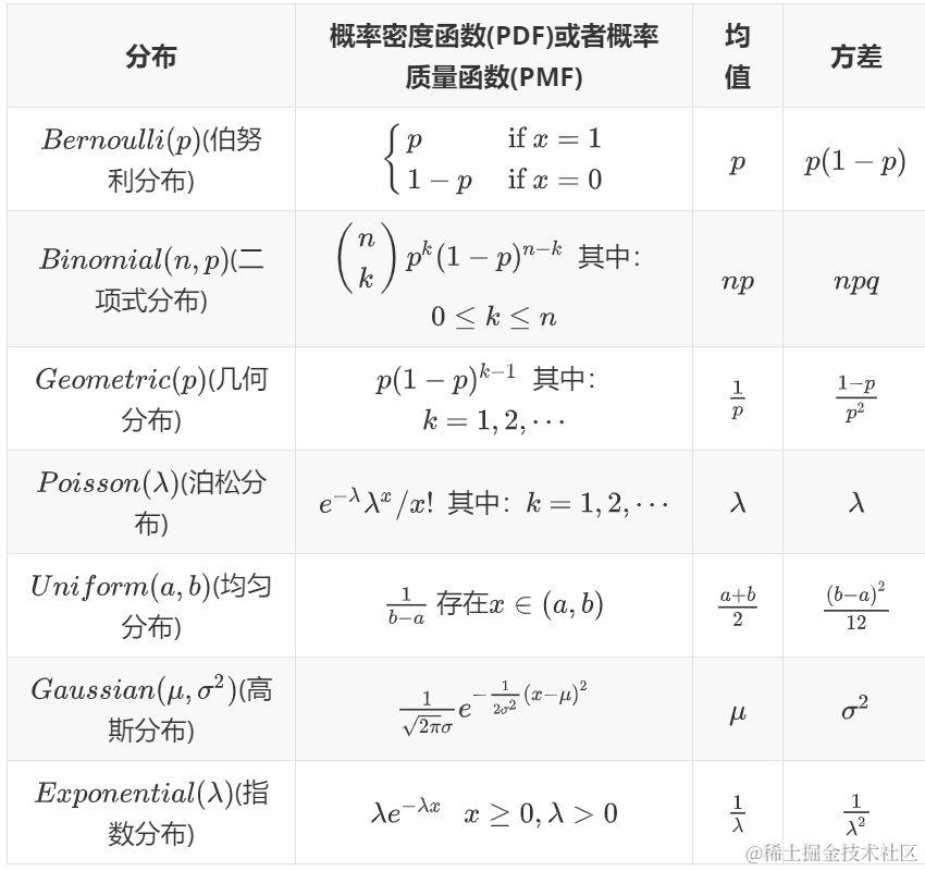 - 几何分布:掷出正面概率为 (其中: )的硬币第一次掷出正面所需要的次数。