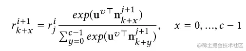 一个全连接树,历史向量u作为输入,每一个节点有一个决策向量n,从父节点继承权重。第i层第j个节点。假定其有c个子节点,其权重分配: