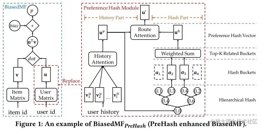 为了生成最终的用户偏好向量,PreHash使用一个注意力网络。将 「两个向量变成最终的用户表示」 。类似加权求和的效果。